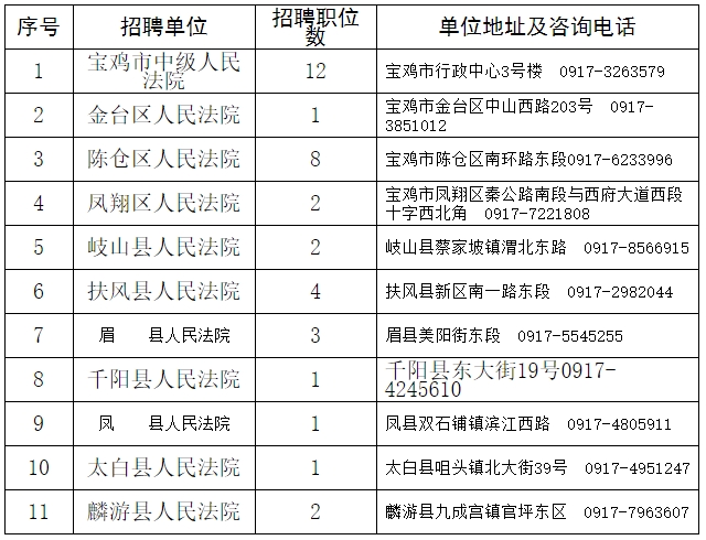 全市法院共招聘聘用制書記員37名,各法院招聘職位、地址及政策咨詢電話詳見《寶雞法院2023年面向社會公開招聘聘用制書記員職位表》(附件)。